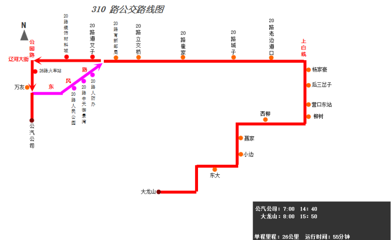由公汽公司始發(fā),途經(jīng)公園路、建設(shè)街東風路/遼河大街、遼河大街、營大路、上白線、營口東站路口、柳樹鎮(zhèn),終點到達大龍山